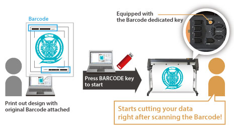 By reading the Graphtec original Barcode, CE7000 automatically detects its linked data from PC or USB flash memory. This function is available regardless of which printer or RIP software is used.